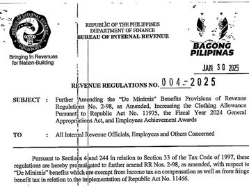 Amending the "De Minimis" benefit provisions of RR No. 2-98, increasing the clothing allowanceand employees achievement awards